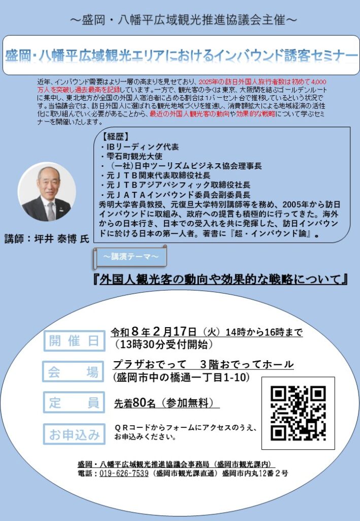 「盛岡・八幡平広域観光エリアにおけるインバウンド誘客セミナー」を開催します
